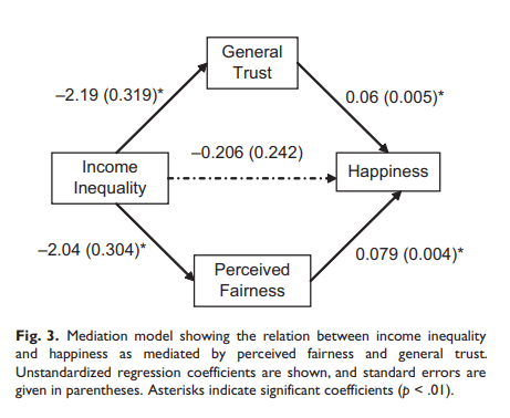 From this, it is reasonable to conclude that income inequality, by way of decreasing trust as well as perceived fairness, results in lower societal happiness. In other words, our intuition is correct.